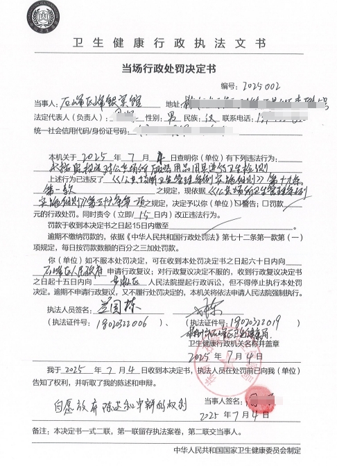 石峰区峰银宾馆未按照规定对公共场所顾客用品用具进行卫生检测案
