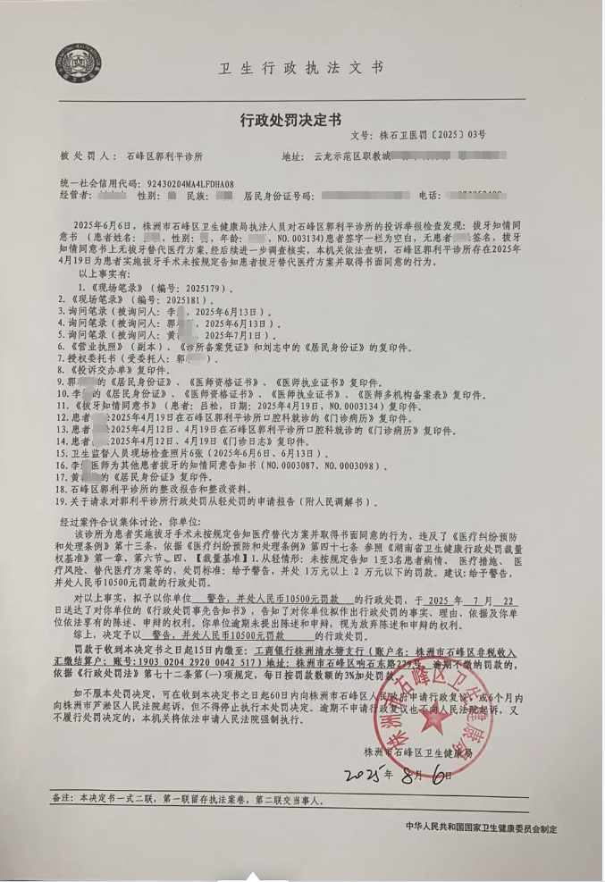 石峰区郭利平诊所为患者实施拔牙手术未按规定告知替代医疗方案并取得书面同意案