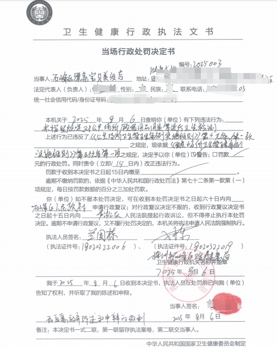 石峰区漂亮宝贝美发店未按照规定对公共场所顾客用品用具进行卫生检测案