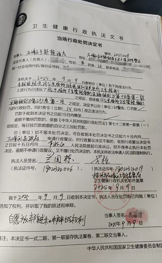 石峰区卡斯顿酒店未按照规定对公共场所顾客用品用具进行卫生检测案