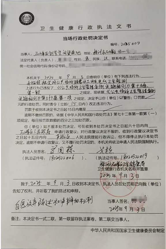 石峰区创艺空间烫染吧未按照规定对公共场所顾客用品用具进行卫生检测案