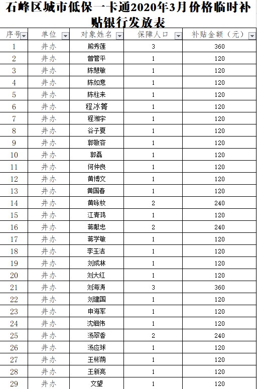 石峰区城市低保一卡通2020年3月价格临时补贴银行发放表