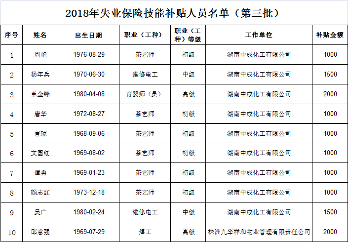 根据湘人社发[2017]50号文件要求,经各参保职工申报,通过株洲市石峰区社会保险服务中心失业保险办公室初审、复审等程序,拟对符合条件的10人发放失业保险参保职工技能提升补贴。为确保准确落实相关政策规定,现将10人(名单附后)予以公示,公示时间七天(2018年9月4日-2018年9月10日)。如有异议,请在公示期内实名书面反映。