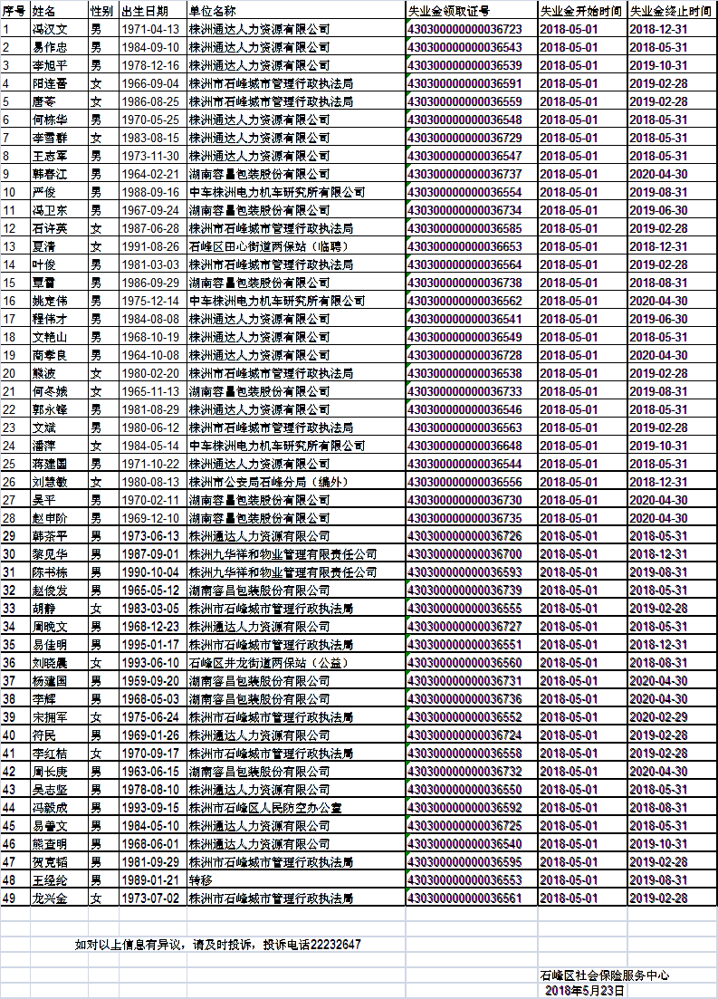 2018年5月石峰区失业保险新增领取失业金人员名单