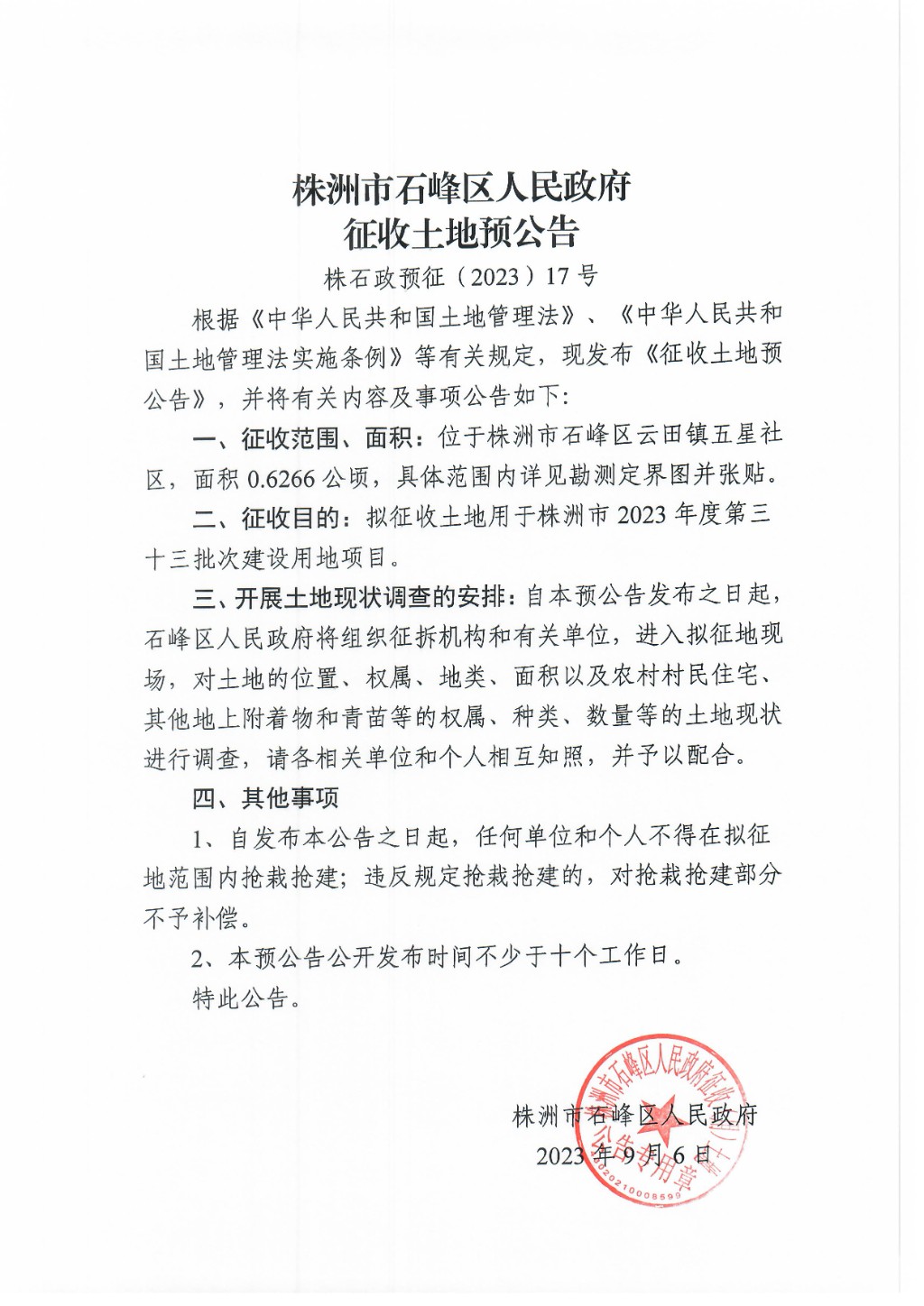 株洲市2023年度第三十三批次建设用地项目 (株石政预征(2023)17号)