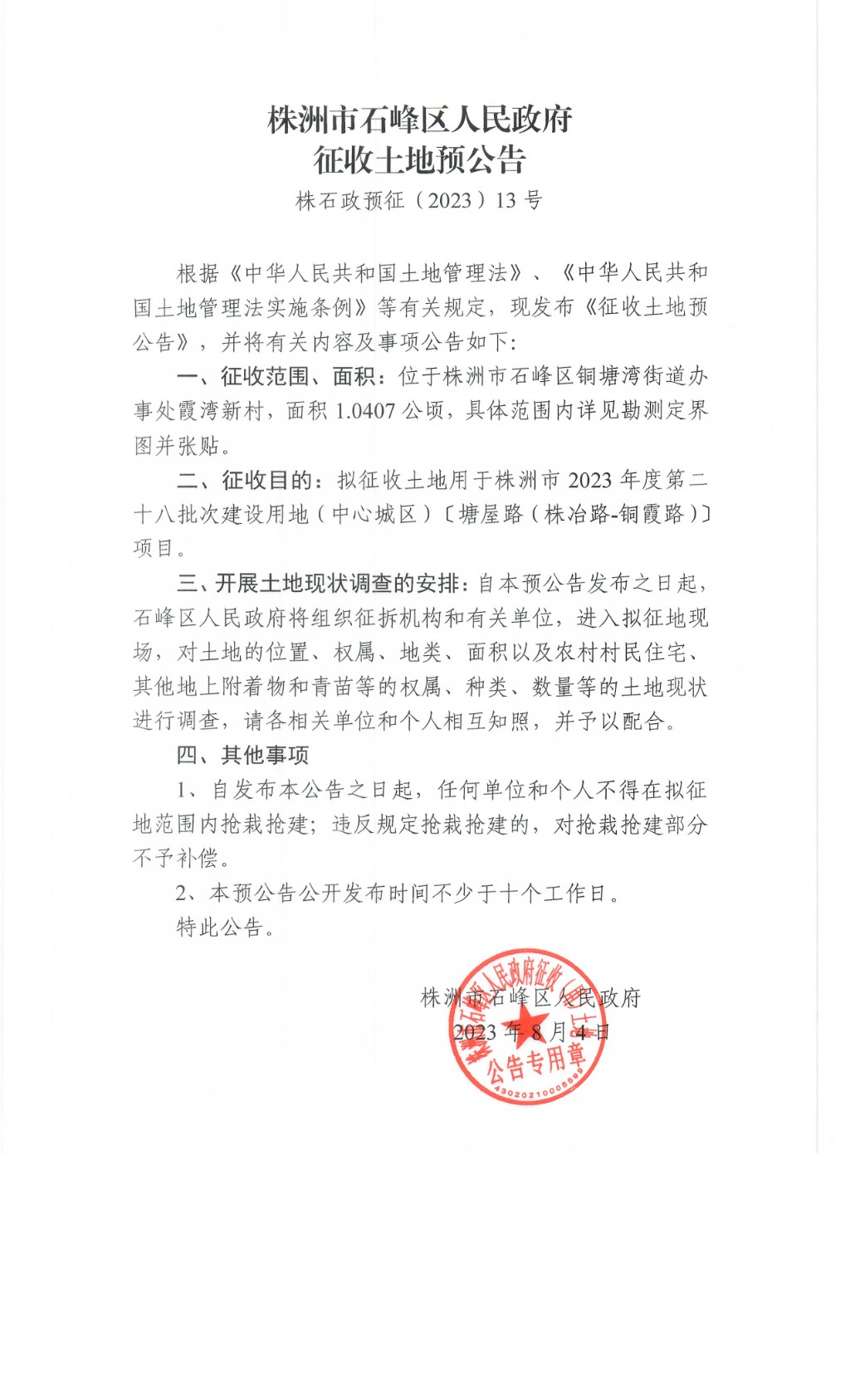 株洲市2023年度第二十八批次建设用地(中心城区)[塘屋路(株冶路-铜霞路)]项目株石政预征(2023)13号