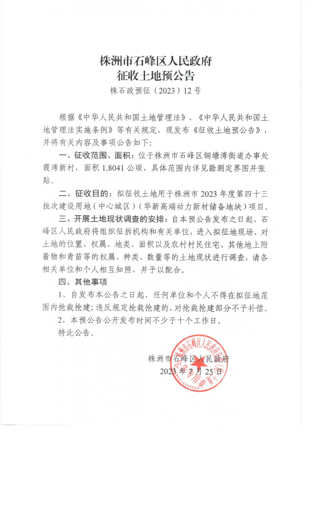 株洲市2023年度第四十三批次建设用地(中心城区)(华新高端动力新材储备地块)项目(株石政预征(2023)12号)