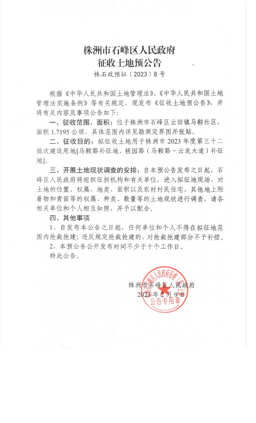 株洲市2023年度第三十二批次建设用地[马鞍路补征地、桃园路(马鞍路-云龙大道)补征地](株石政预征﹝2023﹞8号)