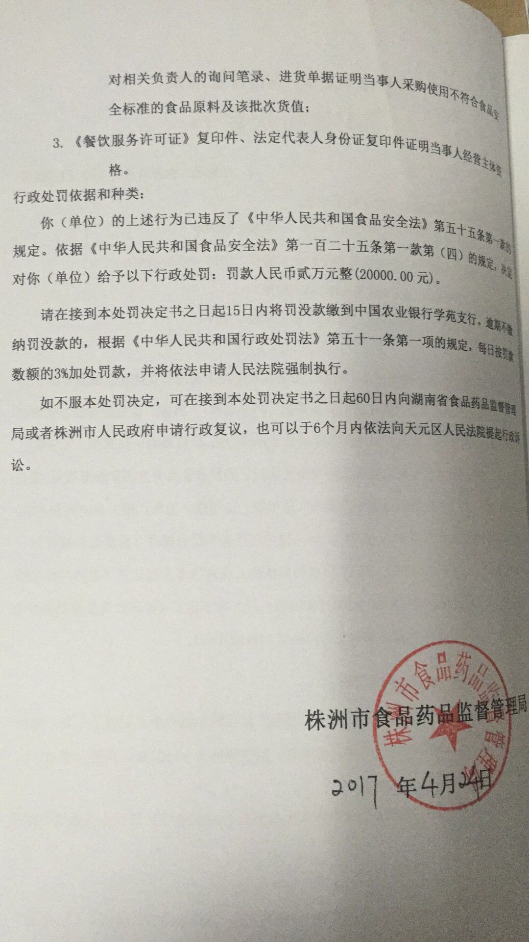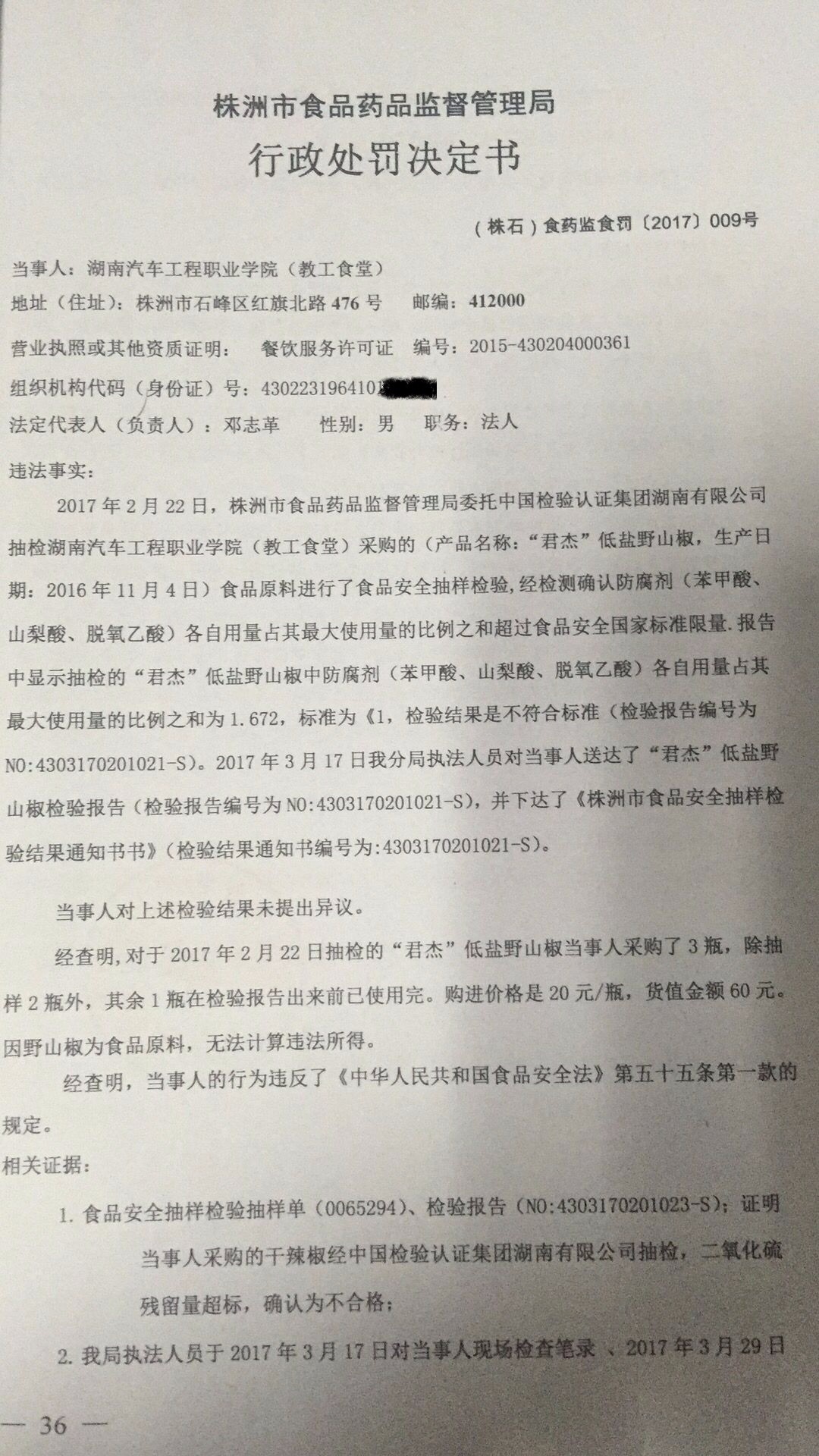 株洲市食品药品监督管理局石峰分局行政处罚公开(株石食药监食罚〔2017〕009号 )