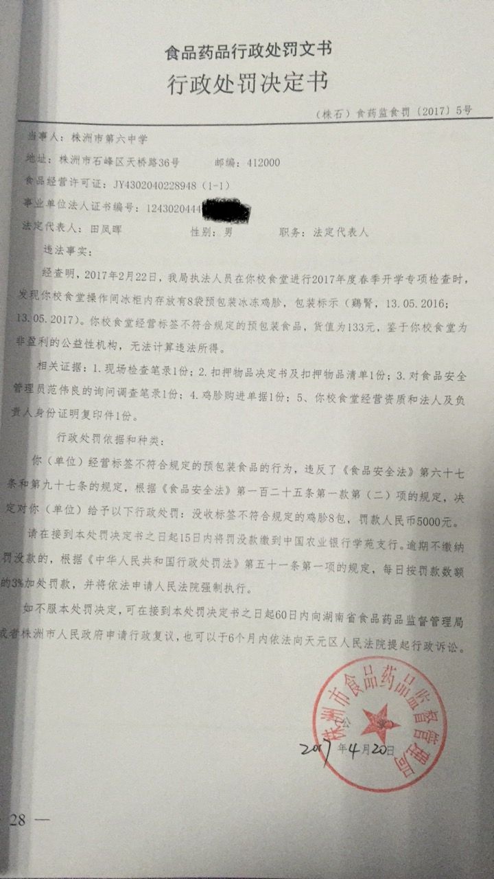 株洲市食品药品监督管理局石峰分局行政处罚公开(株石食药监食罚〔2017〕5号 )