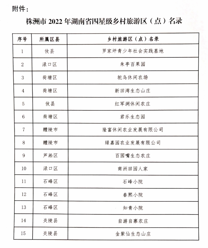 近日,株洲市旅游景区质量评定委员会发布了《株洲市旅游景区质量等级评定委员会公告》(2022年2号)文件,依照湖南省地方标准《乡村旅游服务经营基本条件》(DB43/T483-2017)与《乡村旅游服务星级服务准则》(DB43/T484-2017),经县(市)区初评和推荐,市旅游景区质量等级评定委员会组织评定,正式评定了一批符合湖南省四星级乡村旅游区(点)质量等级标准的旅游企业。