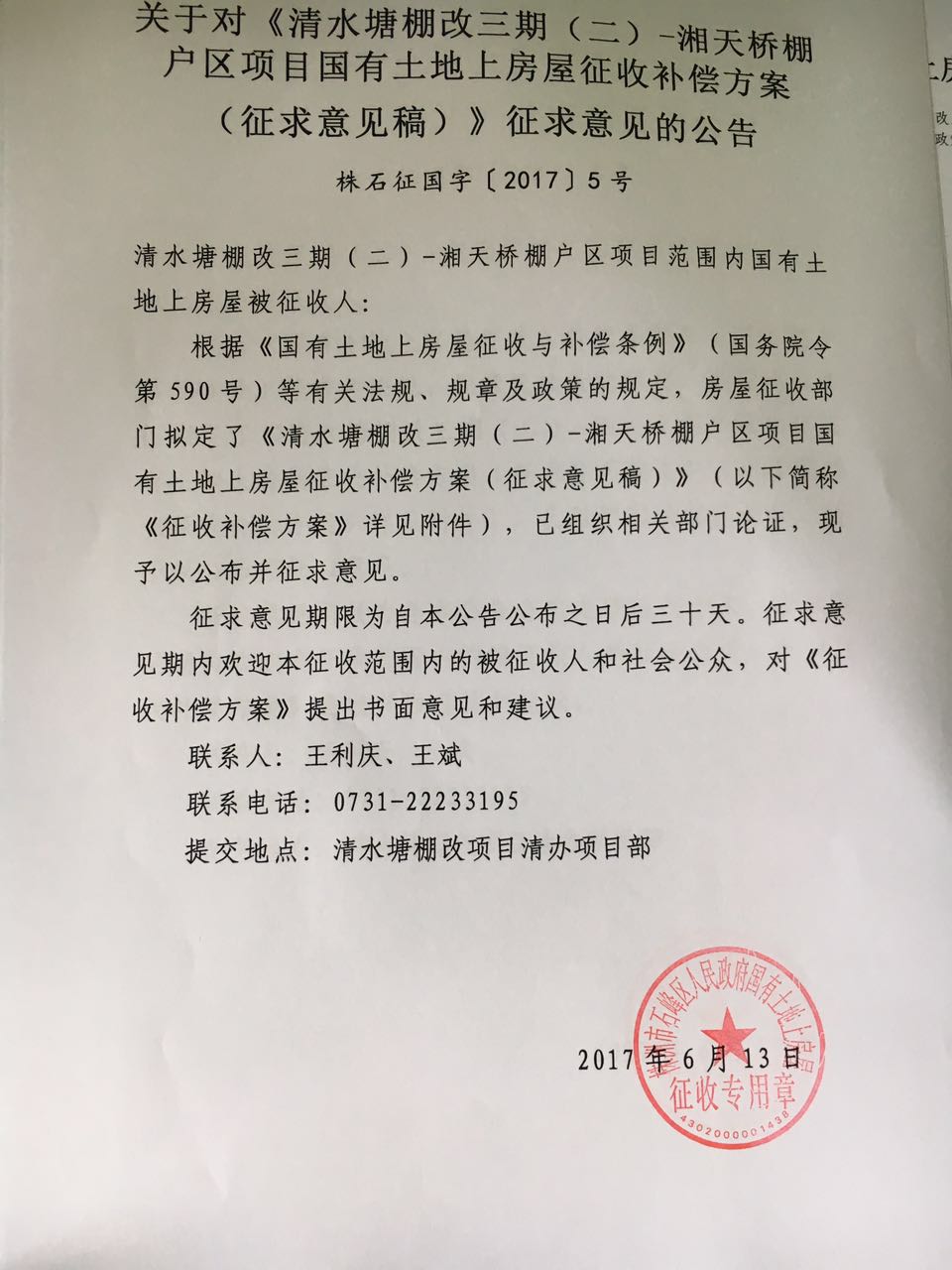 关于对《清水塘棚改三期(二)-湘天桥棚户区项目国有土地上房屋征收补偿方案