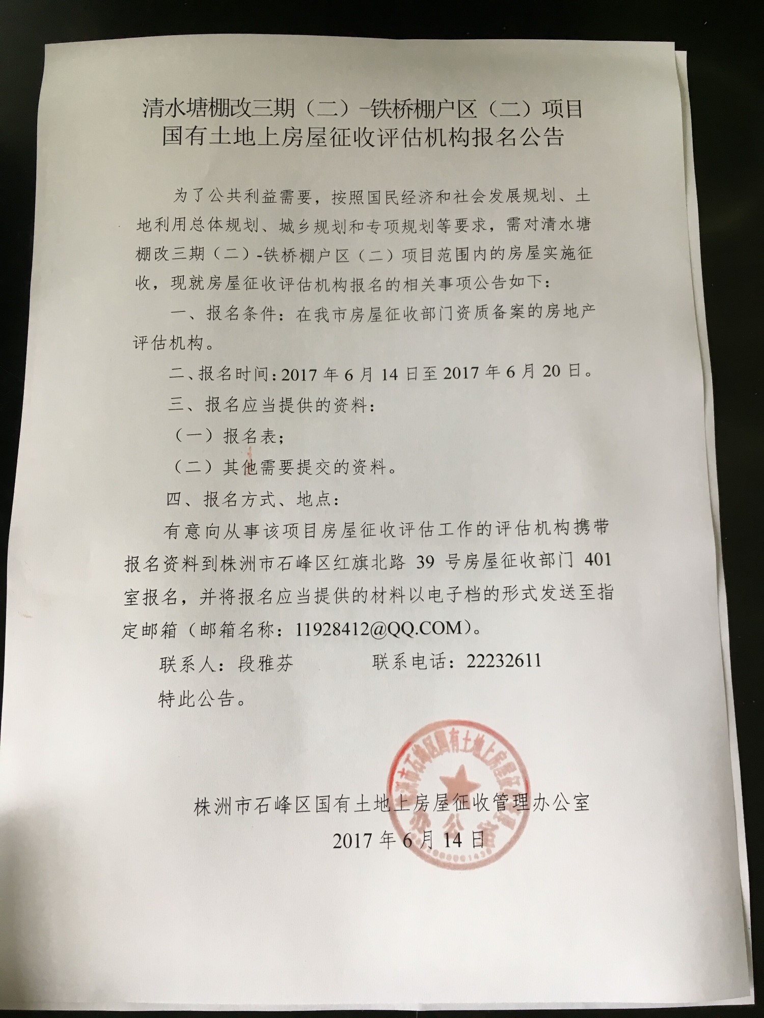 有意向从事该项目房屋征收评估工作的评估机构携带报名资料到株洲市石峰区红旗北路39号房屋征收部门401室报名,并将报名应当提供的材料以电子档的形式发送至指定邮箱(邮箱名称:11928412@QQ.COM)。