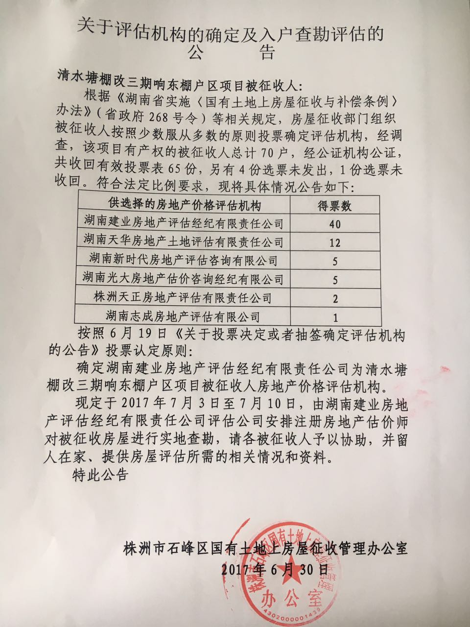 清水塘棚改三期响东棚户区关于评估机构的确定及入户查勘评估的