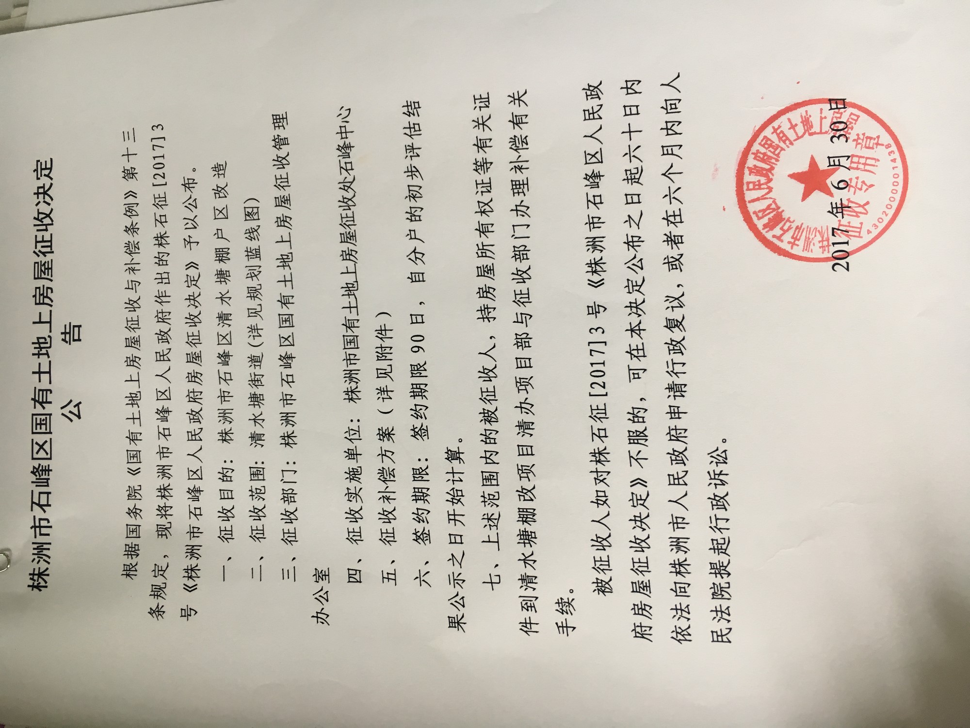 根据国务院《国有土地上房屋征收与补偿条例》第十三条规定,现将株洲市石峰区人民政府作出的株石征[2017]3号《株洲市石峰区人民政府房屋征收决定》予以公布。