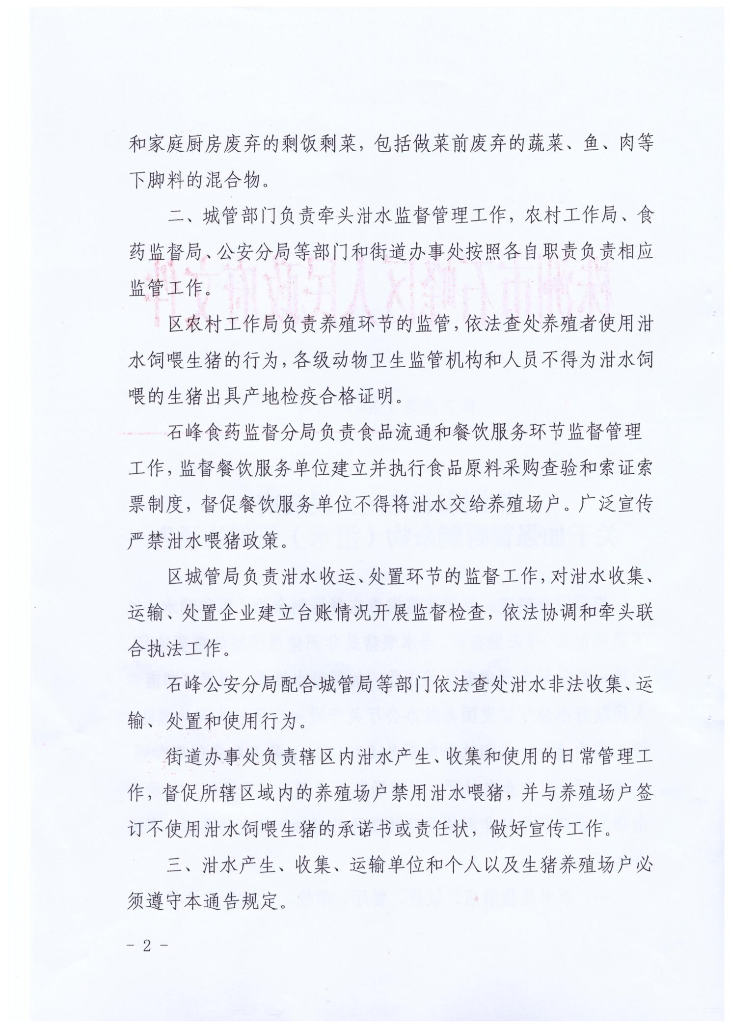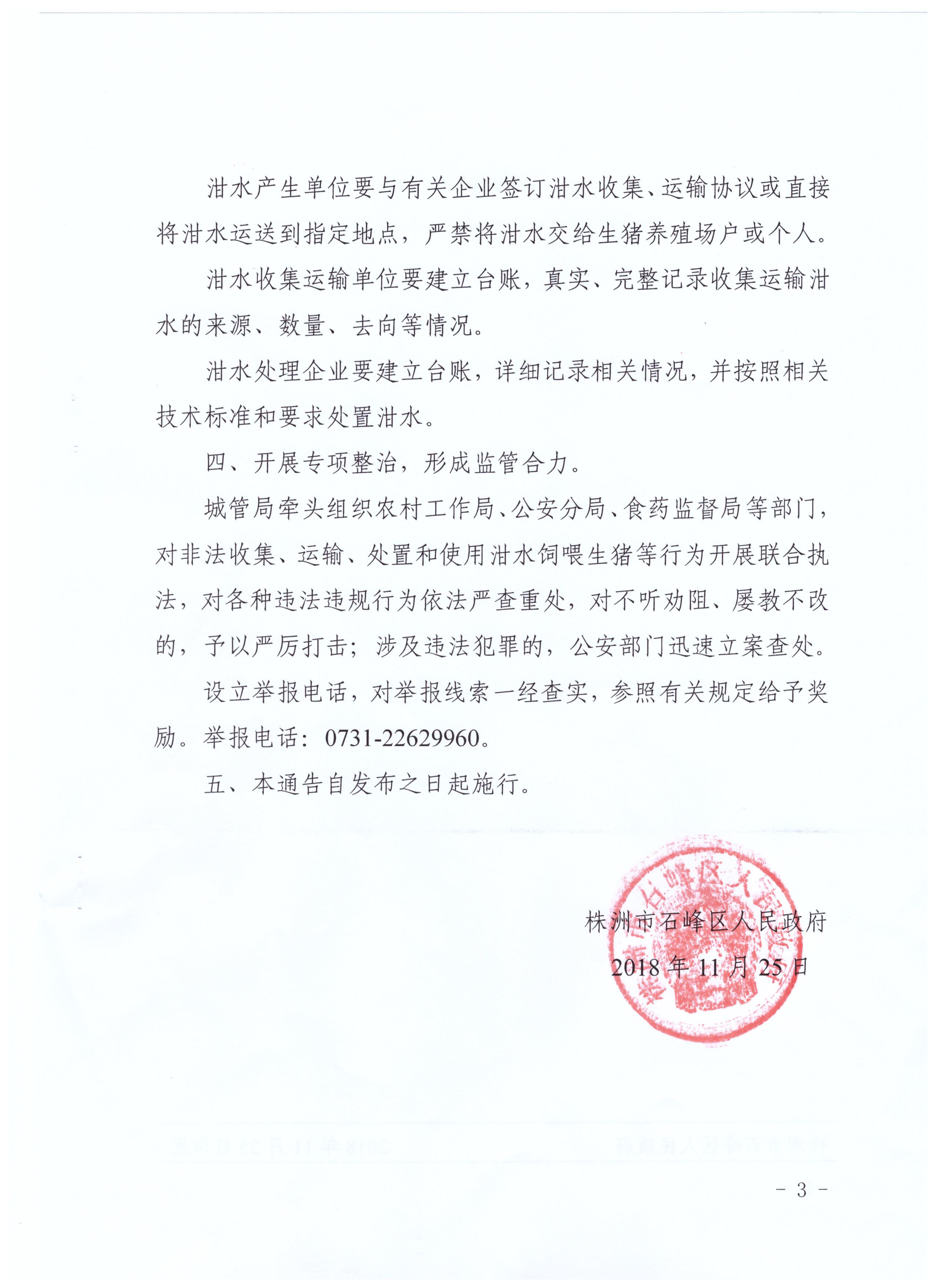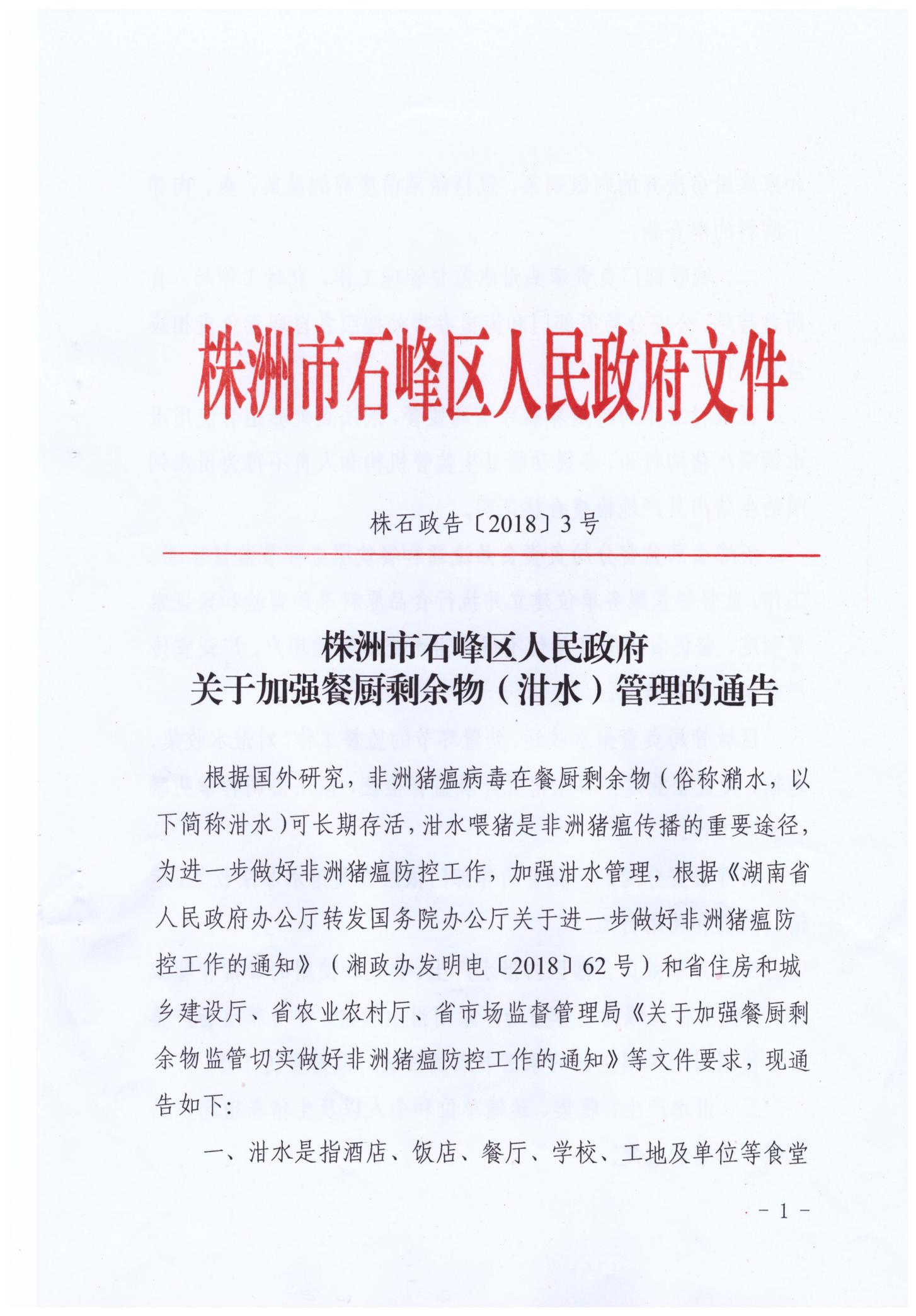 株洲市石峰区人民政府关于加强餐厨剩余物(泔水)管理的通告