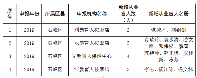 根据《湖南省残疾人联合会 湖南省财政厅关于印发的通知》湘残联字〔2018〕1号文件精神,现对我区申报盲人按摩机构建设补贴的盲人按摩机构进行公示,接受公众监督,如有异议,可通过来信、来电、来访的形式向区残联(区政务大楼四楼)反映情况,我们将对举报人进行严格保密。 举报监督电话:22232651