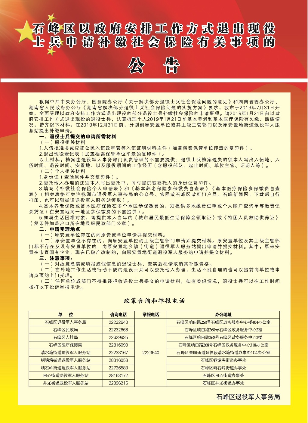 根据中共中央办公厅、国务院办公厅《关于解决部分退役士兵社会保险问题的意见》和湖南省委办公厅、湖南省人民政府办公厅《湖南省解决部分退役士兵社会保险问题的实施方案》要求,我市于2019年7月31日开始,全面受理以政府安排工作方式退出现役的部分退役士兵补缴社会保险的申请事项。请2019年1月21日前以政府安排工作方式退出现役的退役士兵,认真梳理个人2019年1月21日前基本养老和基本医疗保险有欠缴、断缴情况,带齐以下材料,在2019年12月31日前,分别到原安置单位或其上级主管部门以及原安置地街道退役军人服务站提出补缴申请。