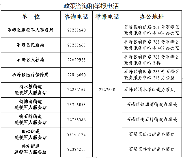 (三)任何单位或部门不得推诿拒收退役士兵提交的申请材料,如有类似情况,退役士兵可以在工作时间拨打以下投诉举报电话。