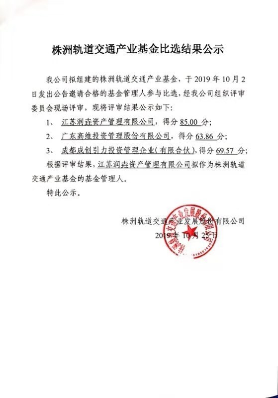 株洲轨道交通产业基金比选结果公示