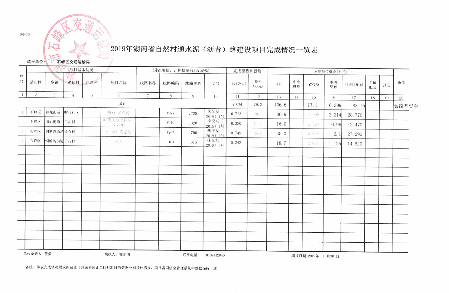 2019年石峰区自然村通水泥(沥青)路建设项目完成情况一览表
