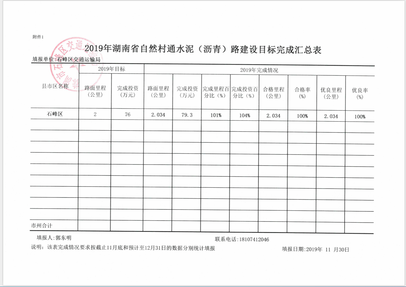 2019年石峰区自然村通水泥(沥青)路建设目标完成汇总表