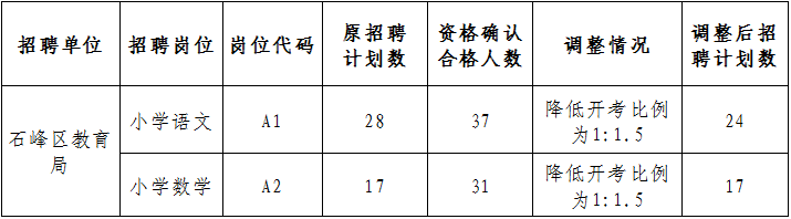 根据《株洲市石峰区2020年面向高校应届毕业生招聘教师公告》的相关要求,经网上报名及资格审查后,因小学语文、小学数学岗位报名人数未达到公告要求中1:3的最低开考比例,经株洲市石峰区公开招聘教师工作领导小组研究,株洲市石峰区人力资源和社会保障局同意,决定降低小学语文、小学数学岗位的开考比例,减少小学语文岗位招聘计划数。具体情况公告如下:
