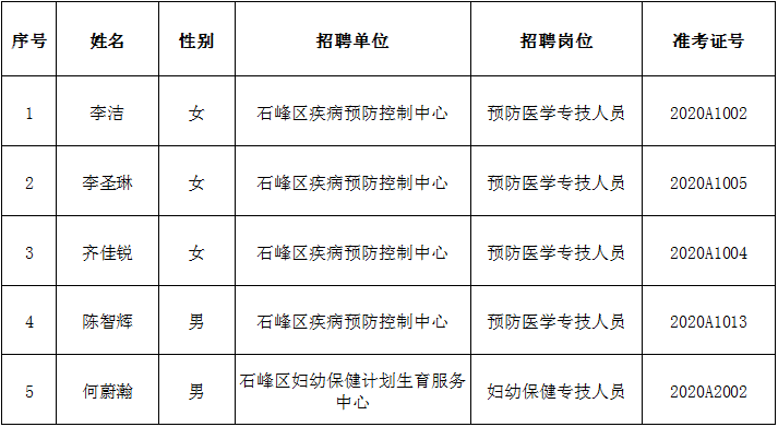 株洲市石峰区2020年面向高校应届毕业生公开招聘卫生专业技术人员体检合格考生名单