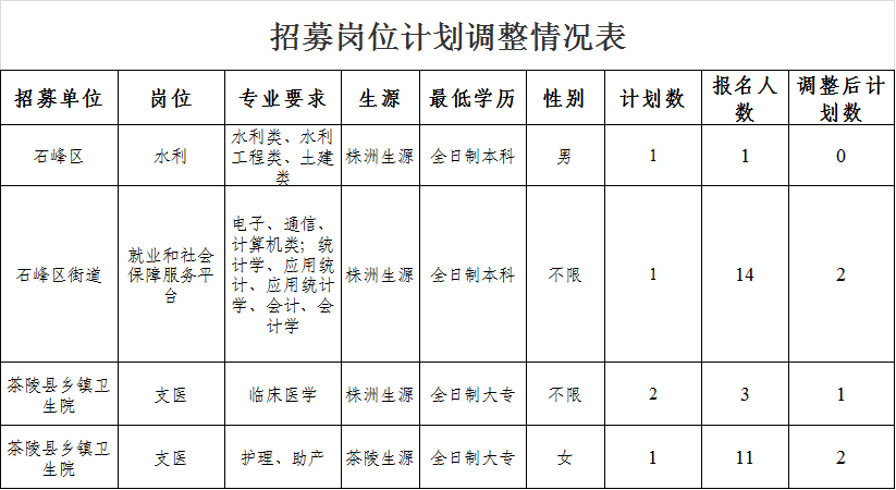 根据《2020年株洲市高校毕业生“三支一扶”计划招募公告》的要求,选拔计划与报名人数应不低于1∶3的比例,对报名人数未达到最低开考比例的职位,相应核减招募计划,在县市区内进行岗位调剂。今年“三支一扶”计划招募报名已截止,石峰区水利和茶陵县乡镇卫生院支医(临床医学)2个职位未达到开考比例。经石峰区和茶陵县申请,株洲市“三支一扶”工作协调管理办公室研究,现将相关招募岗位计划作如下调整: