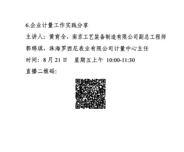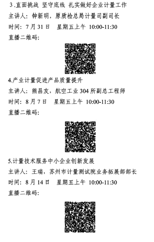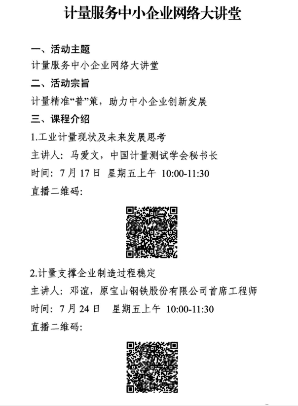 计量服务中小企业网络大讲堂由国家市场监督管理总局计量司主办,以计量精准“普”策、助力中小企业创新发展为活动宗旨,从7月17日开始,每周五上午10点准时开播,将邀请来自政府部门、行业协会、技术机构和企业的计量大咖们,通过“计量服务中小企业网络大讲堂”的形式,为广大企业和计量同仁们讲授企业计量知识。7月24日《计量支撑企业制造过程稳定》、7月31日《产业计量促进产品质量提升》等课程即将上线。计量从业人员可在直播时间扫码进入直播观看。