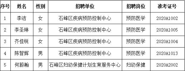 根据《株洲市石峰区2020年面向高校应届毕业生公开招聘卫生专业技术人员公告》及有关规定,经报名、资格审查、面试、实际操作能力测试、体检、考察等程序,经公开招聘领导小组研究,确定李洁等5名同志为石峰区2020年面向高校应届毕业生公开招聘卫生专业技术人员拟聘用人选,现予以公示: