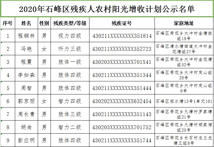 根据省残联、省财政厅《关于在残疾人脱贫攻坚战中实施"农村残疾人阳光增收计划"的通知》(湘残联字〔2017〕16号)、省残联《关于下达2020年度"农村残疾人阳光增收计划"任务指标的通知》(湘残教就字〔2020〕1号)的文件精神,现对我区申报2020年度"农村残疾人阳光增收计划"服务对象名单进行公示,接受公众监督,如有异议,可通过来信、来电、来访的形式向区残联(区政务大楼四楼)反映情况,我们将对举报人进行严格保密。
