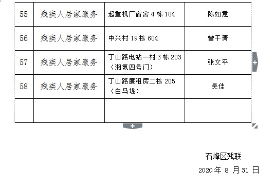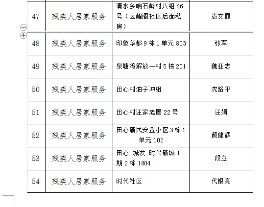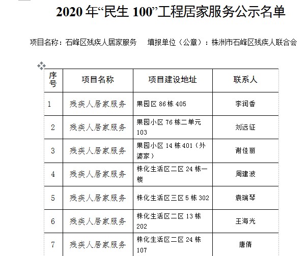 按照省残联《关于下达2020年度残疾人托养任务的通知》(湘残教就字〔2019〕23号)《关于下达2020年度残疾人托养任务的通知》株残教就字〔2020〕2号文件精神,现对我区申报2020年"民生100"居家服务对象进行公示,接受公众监督,如有异议,可通过来信、来电、来访的形式向区残联(区政务大楼四楼)反映情况,我们将对举报人进行严格保密。