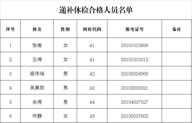 根据《公告》的相关规定,我区按要求对递补考生进行了体检,其中20101013012考生因医院给出“不合格”结论,已向我局申请复查,现将体检合格人员名单予以公示(见附件)。