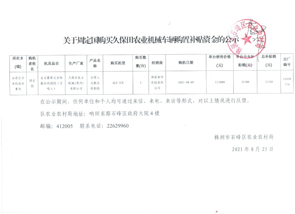 关于周定国购买久保田农业机械车辆购置补贴资金的公示