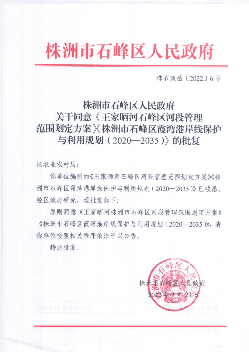 株洲市石峰区人民政府:关于同意《《王家晒河石峰区河段管理 范围划定方案》《株洲市石峰区霞湾港岸线保护与利用规划(2020—2035)》批复