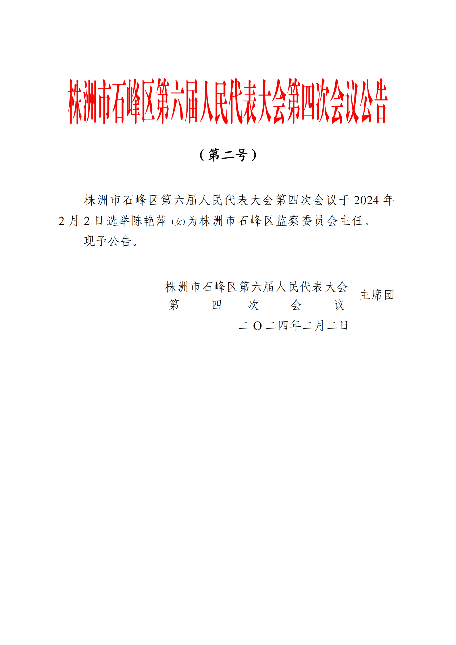 株洲市石峰区第六届人民代表大会第四次会议公告(第二号)