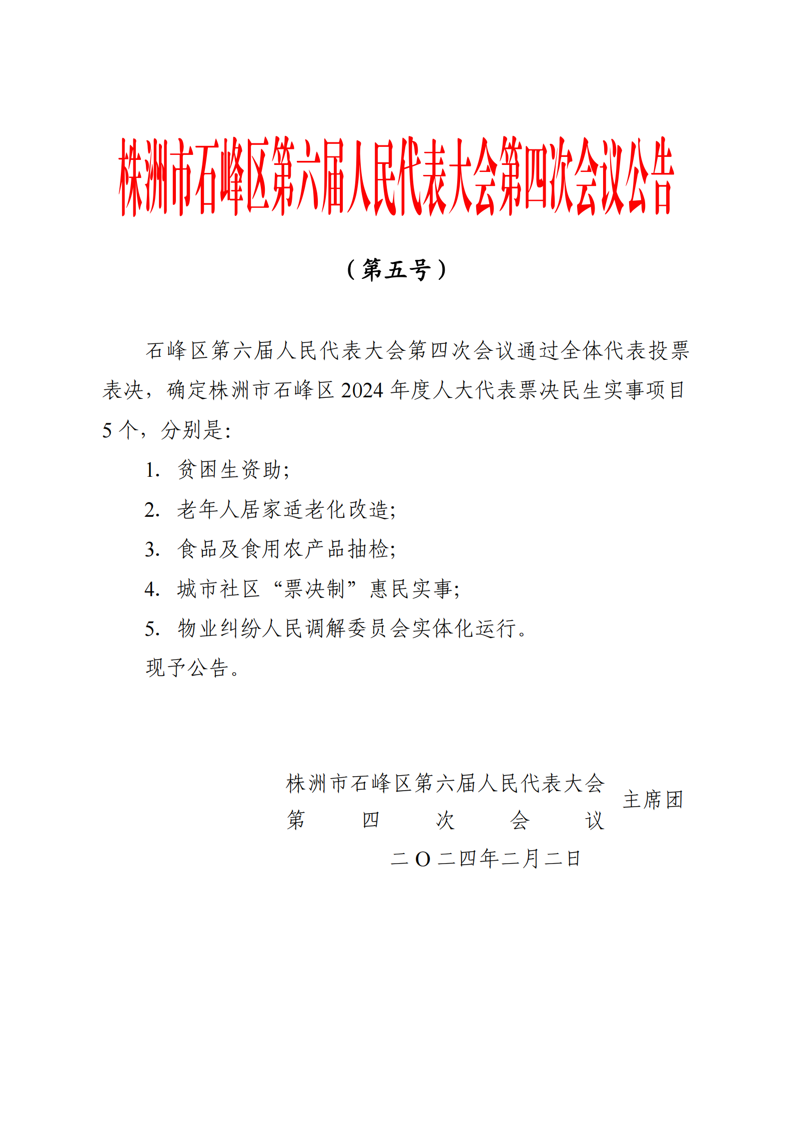 株洲市石峰区第六届人民代表大会第四次会议公告(第五号)