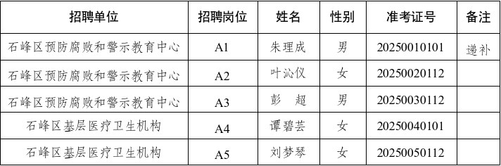 根据《2025年株洲市石峰区面向社会公开招聘事业单位工作人员公告》及有关规定,经现场报名、资格审查、笔试、面试、体检、考察等程序,经研究,确定朱理成等5名同志为拟聘用人员,现予以公示。
