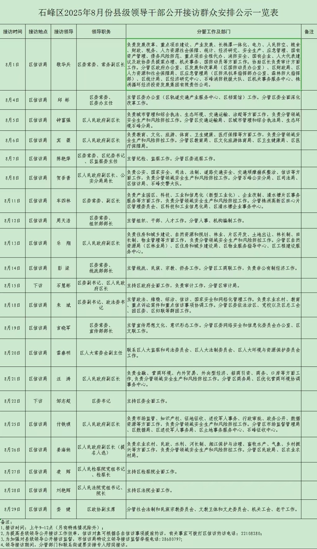 为进一步密切联系群众,畅通信访渠道,依法及时就地解决群众合理诉求,从2022年3月1日开始,建立领导预约接访制度,每个工作日由县级领导轮流到信访部门定期公开接访。现将2025年8月份县级领导接访安排公示如下。