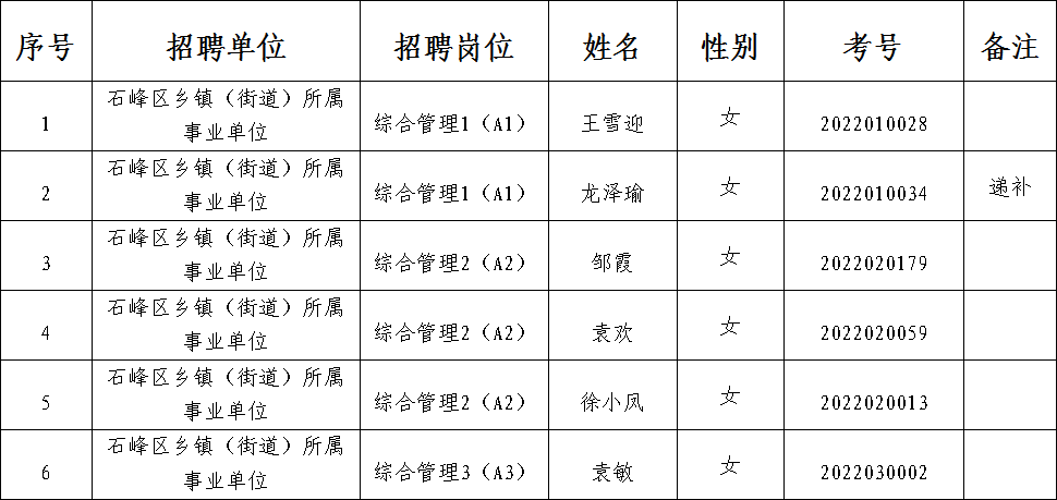 根据《2022年株洲市石峰区乡镇(街道)所属事业单位公开招聘公告》及有关规定,经现场报名、资格审查、笔试、面试、体检、考察等程序,经研究,确定王雪迎等6名同志为拟聘用人员,现予以公示。