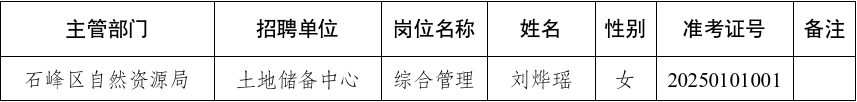 根据《2025年株洲市石峰区事业单位面向高校优秀毕业生公开招聘高层次人才公告》及有关规定,经现场报名、资格审查、直接考核、体检、考察等程序,经研究,确定刘烨瑶同志为拟聘用人员,现予以公示。